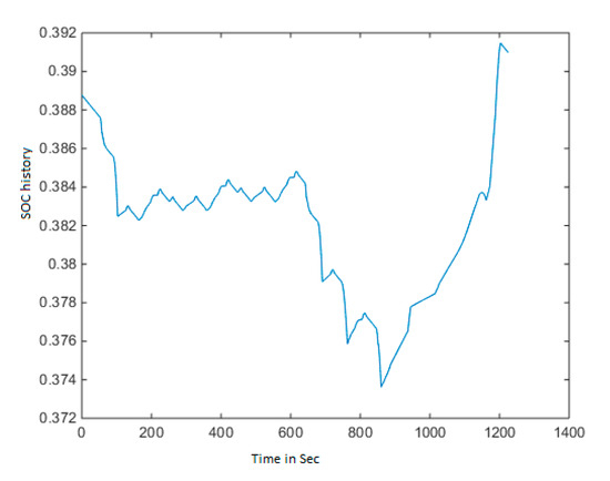 Figure 14 and Figure 15 show the vehicle performance change after optimization of its design with the MABC + SQP approach for the ECE-EUDC driving cycle, Case 1. Figure 14 shows the battery SOC variation with respect to the driving cycle, and it can be observed from the figure that variation between the initial and final value of battery SOC is less than 0.5% and SOC value lies close to 39%.