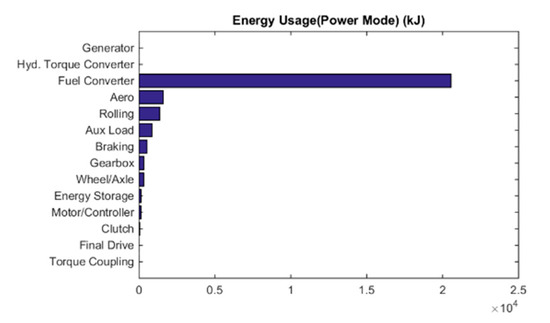 Moreover, Figure 22 and Figure 23 represent the energy utilization of different key components of the vehicle during power mode and regeneration mode of the vehicle. It can be observed from these figures that the energy utilized by the fuel converter is higher during the power mode, which is about 19,000 kJ, and energy utilized by the motor controller is close to 800 kJ during regeneration mode, in order to recharge the battery and keep it within the intended SOC level. Also, it can be seen that although the efficiency of the fuel converter is around 24% only, which is similar to the previous case, the energy loss has been reduced after optimization. Furthermore, energy usage by braking components is also near to 550 kJ in this mode, to support higher energy regeneration.