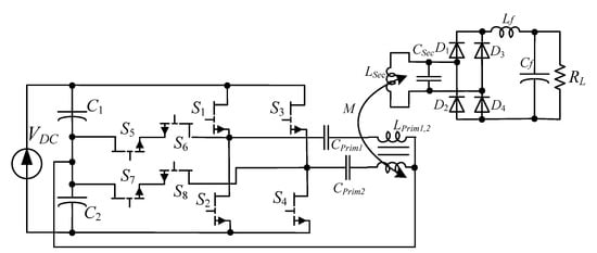 In the scheme, Vdc is the source of the input dc voltage; C1, C2—input capacitors; S1–S4—switches of the single-phase full-bridge inverter; S5, S6 and S7, S8—auxiliary bidirectional switches; Lprim1,2—coupled primaries inductances; Cprim1, Cprim2—primaries compensating capacitances; Lsec—secondary inductance; Csec—secondary compensating capacitance; D1–D4—bridge rectifier; Cf—filter capacitor; Lf—filter inductance; RL—output resistive load.