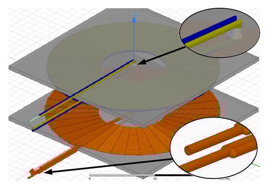 The simulation was performed in almost the same order as described in []. The model of coils was carried out in ANSYS Electrimagnetic Suite and designed using the Finite Elements Modeling (FEM) method. The transmission coils are on the top and the receiving coil is on the bottom (Figure 3).