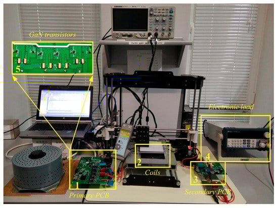 Experimental laboratory GaN-based WPT system: (1)—primary side Printed Circuit Board (PCB); (2)—transmitting and receiving coils; (3)—secondary side PCB; (4)—electronic dc load; (5)—GaN transistors located on the bottom of the primary PCB.