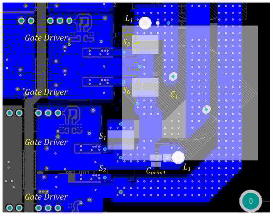 The PCB consists of four copper layers, divided into signal and power parts. In the signal part of the board top and bottom layers are devoted for signal traces and internal layers for power supply voltage and ground polygons. In contrast, all layers, external as well as internal, are used for power traces. Some special techniques were used on the PCB aiming increase the efficiency and decrease power losses. First of all, high-current power traces were repeated on all four layers and stitched with via matrix to reduce parasitic resistance of such traces. GaN transistors, as it was mentioned above, were placed on the bottom side of the board in accordance to the producer’s recommendations []. Taking into account that GaN transistors can operate on high frequencies, EMC considerations was implemented on the board. Image of the bottom side of the board with power GaN transistors and other components of one half of T-type circuit is shown on Figure 5. It should be noted that component designators on Figure 5 corresponds to designators on Figure 1. Highlighted components representing current flow in the circuit for switching states marked as “Positive (+)” in the Table 1. As it can be seen, such placement of the components on PCB provides as low as possible square of current loops.