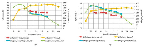 Figure 6 shows that, in general, the efficiency in the model was slightly higher than in the experiments. However, the experimental efficiency also reached more than 90%. The unevenness of the experimental graphs is explained by the fact that the voltage in the grid can vary constantly during the experiment, while in the model, the desired value is specified.