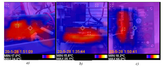 Pictures from the thermal camera at RL = 15 Ω, k = 0.7, f = 200 kHz, Vin = 300 V: (a) transistors temperature; (b) coils temperature; (c) temperature of rectifying diodes.