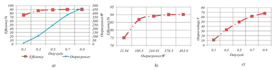 Experimental dependencies at RL = 10 Ω, k = 0.9, f = 150 kHz, Vin = 300 V: (a) efficiency and output power on the duty cycle; (b) efficiency on the output power with the duty cycle change; (c) output voltage on the duty cycle.