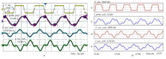 The shape of the signals in the experiment is shown in Figure 9 for one of the used cases. In particular, the voltage at the output of the inverter (V_inv), the current through the primary coil (I_prim_coil), the voltage (V_sec_coil) and current on the secondary coil (I_sec_coil) were recorded.