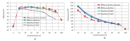 The snubber capacitance was designed to reduce voltage peaks when the transistor is turned on and off, especially at voltage levels close to critical. Snubber capacitors of different capacities were alternately installed between the drain-source leads of the transistors. The addition of a small snubber capacity in the bridges of the T-type scheme has almost no effect on the energy efficiency (Figure 10a). The effect was more noticeable with an increasing capacitor value and an increasing operating frequency of the transistors.