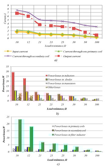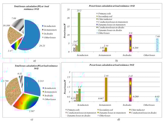 The losses distribution in the semiconductor and magnetic components of the circuit for the same case k = 0.7, f = 150 kHz, Vin = 300 V at a load resistance of 10 Ω and 50 Ω are compared in more detail in Figure 12. The static losses in the inductors and diodes are significant (predominant) (Figure 12a). The reason is that with less resistance there is more input and output current. The total calculated losses are 84% relative to other losses. This ratio is already 95% in Figure 12 that confirms the statement described in []. It can be explained due to a significant decrease in the current value through all elements of the circuit, especially the output current.