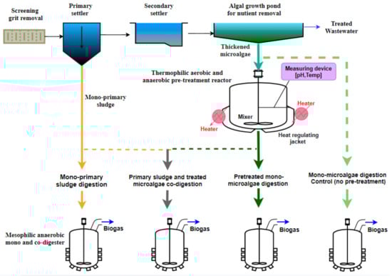 - Du, X.; Tao, Y.; Liu, Y.; Li, H. Stimulating methane production from microalgae by alkaline pretreatment and co-digestion with sludge. Environ. Technol. 2020, 41, 1546–1553. [Google Scholar] [CrossRef] [PubMed]