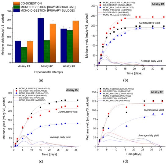 Mono-digestion of microalgae has shown a limited impact on methane yield performance owing to their containing recalcitrant substances resistant to biodegradation. Therefore, pretreatment and co-digestion have been one of the most commonly suggested solutions to efficiently extract and enhance the methane yield from the microalgae [,]. In this section, the potential effect of co-digestion on increasing methane yields in trials of mono-digestion of microalgae between substrates was studied. To this end, a primary sludge substrate was copiously (90% vs.-based) co-digested with the microalgae to enhance the methane yield. A significant increase was observed for all the co-digestion trials even without any pretreatment. To observe the effect of co-digestion, three different samples with different inoculum behavior were compared. These tests were repeats of the same trial, and no changes in the other experimental set-ups were made except for the amount of inoculum. As can be seen in Figure 2a, co-digestion consistently showed a better performance than the mono-digestion of microalgae. The first assay showed a 29% increase in methane yield; the second and the third assays, 74%, and 39% increases, respectively. This is mainly because of the synergy created between the individual substrates, which ultimately increased the carbon-to-nitrogen ratio and reduced the risk of potential inhibition from the released ammonia []. Enhancing methane production through co-digestion from existing anaerobic digestion without increasing the volume of digesters has also been observed in previous works [,,]. However, the yields from mono-digestion of primary sludge in the second and third tests were significantly better than that of co-digestion. This is mainly because both co-digestion and mono-digestion of microalgae entail longer retention times for the digestion of complex biopolymers of algae while the primary sludge retains a higher amount of readily available soluble organic substances for methane production []. Such phenomena can also be observed from the double peaks of the average methane yield of mono-digestion of microalgae in Figure 2b–d. The first peak represents the methane obtained from the readily available soluble algal biomass, while the second peak refers mainly to the yield obtained from the subsequently available recalcitrant components. A relatively flat curve with only one peak was mainly observed in co-digestion confirming the early breakdown of the microalgae cellular structures due to synergistic effects. A similar trend of methane yield was also observed in a previous study []. Hence, it can be deduced from these analyses that co-digestion provided superior performance to microbial degradation of the microalgae biomass.