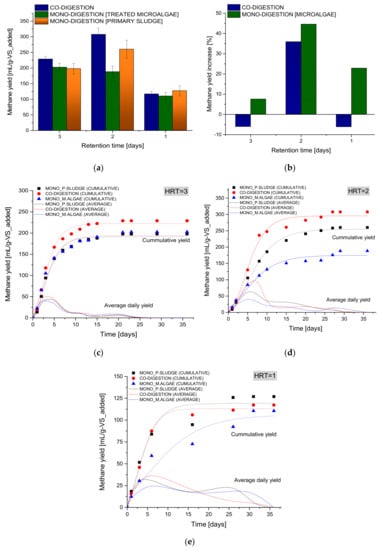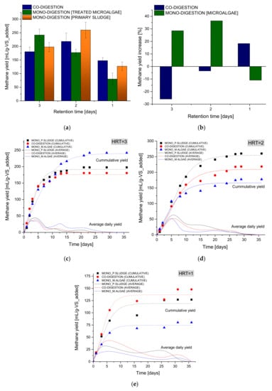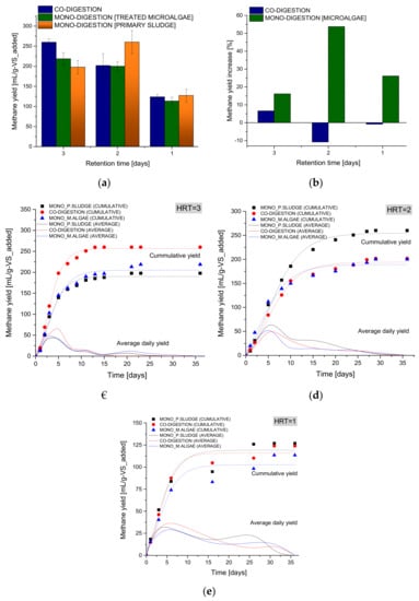 Using aerobic digestion as a pretreatment for co-digestion, a maximum methane yield of 308 mL/g-VS_added was noted at an HRT of 2 days (see Figure 3a). Aerobic pretreatment generally performed better for co-digestion than mono-microalgae digestion and increased the total methane yield by more than 36% as compared to non-pretreated substrates. This result is much higher than the yield attained under mono-microalgae digestion (188 mL/g-VS_added) and mono-primary sludge (203 mL/g-VS_added) at an HRT of 2 days. The superior methane yield performance of co-digestion might result from the high enzymatic activity of the aerobic microbes []. Moreover, the biodegradability of the microalgae when co-digested with the activated primary sludge resulted from the large number and diversity of aerobic microorganisms in the sludge that assisted the initial hydrolysis of the recalcitrant cellulosic cell-wall of the microalgae [,]. In addition, the CO2 dissolved in the form of carbonate or bicarbonate might have also been used as a substrate for hydrogenotrophic methanogens [].