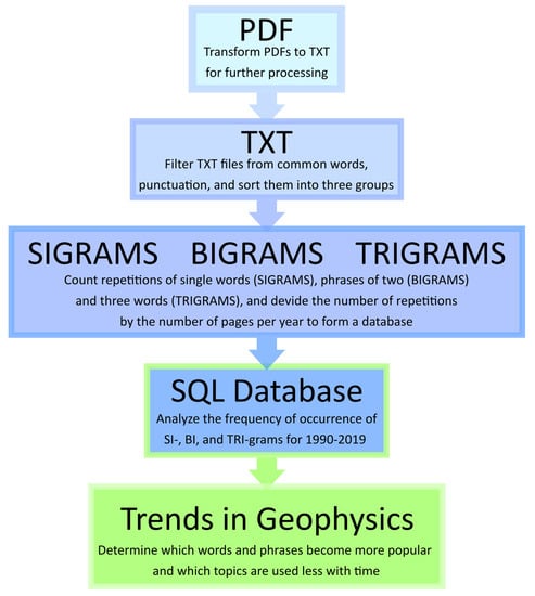 We used the digital versions of the SEG Annual Conference proceedings that have been available online for 30 years. Figure 1 shows our workflow. We digitized articles in the PDF format from the SEG digital library website, converted them into plain TXT format using “pdftotext” with “nopgbrk” (ignore page breaks), “enc ASCII7” (encode ASCII7 for the output) and “eol” (set the end-of-line convention) flags. The text dump was filtered to remove common words, misspellings, etc. from a NLTK dictionary “stopwords.” After the initial filtering, we tokenized the text by year and obtained si-, bi-, and trigrams (“sigram”-is a word, “bigram”-a two-word phrase, and “trigram”-a three-word phrase.). According to [], with a handful of exceptions most of geophysical English terms are formed by one, two, or three words. Hence in this manuscript, we only consider si-, bi-, and trigrams. Furthermore, we counted the number of times each word or phrase was repeated in the text. In the end, the entire text accumulated over 30 years is transformed into list of words and phrases with the corresponding number of repetitions for each year. We then analyze this list during an observation time, and display the results in a graphical format.