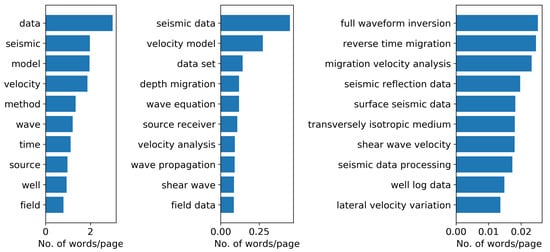 In addition to conference proceedings, one can use journal articles for data mining as the volume of data each year is comparable to that in the SEG Annual Conference and Exhibition proceedings. For example, Vlad analyzed author information of the papers in the geophysics journals between 1936 and 2017 [], not considering article texts and the use of terms. He studied the number of co-authors, the number of publications by various universities and institutes, and other interesting features of 11,658 articles published over 81 years. The number of journal publications per year is smaller, but they are full-size papers. However, the release of articles in journals occurs with significant delays, and it is periodic, monthly or quarterly. At a conference, publications happen all at once each year. The research materials published in journals are usually reported at conferences; therefore, the conference proceedings include most of the content of full-size articles. Moreover, the number of research teams presenting their work is several times larger in conference proceedings when compared with the study of any particular journal. SEG annual conference proceedings represent a collection of scientific research from a large number of scientific and engineering teams in one place each of the 30 years. Therefore, their analysis allows one to conduct a uniquely comprehensive language study and trace the dynamics of changes in academia and industry.