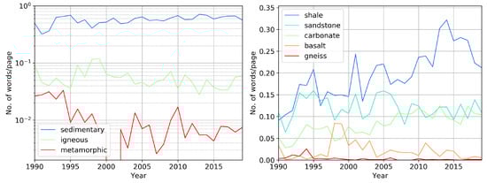 Figure 3 breaks down the most studied types of rocks. Each of the words on the left includes the most common names of rocks, e.g., sedimentary: shale, sandstone, conglomerate, carbonate, etc.; igneous: granite, diorite, basalt etc.; metamorphic: gneiss, phyllite, slate, etc. It shows the relative distribution of the objects of study: most research deals with the sedimentary rocks. Terms that describe igneous rocks are used about ten times less than “sedimentary,” and the least used terms are related to metamorphic rocks. Figure 3 (right) shows the occurrence of rock types with time. The shale revolution that started in 2007 is clearly visible. The most frequent names of rocks are “shale,” “sandstone” and “carbonate.” We note how “shale” peaks around 2015 and starts declining afterwards. In addition, there is a steady increase in the appearance of “carbonate” (1990–2005), while “sandstone” has been used uniformly over the years. An attentive reader may notice that during the growth of the use of “shale,” the fluctuations in the use of “sandstone” and “carbonate” decreased.