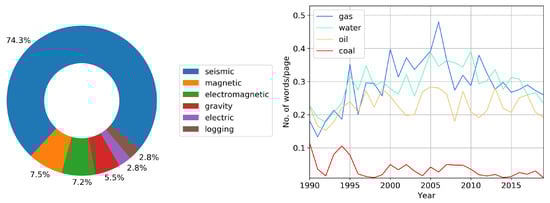 We break down the logical sum (Each of the words represents the sum of the related words: “seismic,” “seismics”; “magnetic,” “geomagnetic,” “aeromagnetic”; “electromagnetic,” “em”; “gravity,” “gravimetry,” “gravimetric”; “electric,” “geoelectric”; “logging,” “borehole geophysics.” Please note that we present here words related mainly to methods of exploration geophysics. We have not mentioned words related to other branches of geophysics, because they are much less common in the SEG annual meetings.) of the names of geophysical methods used between 1990 and 2019, see Figure 4 (left). These composite words practically do not change over time, and we show the total in a pie chart. In Figure 4 (left) we show the occurrence of the most common geophysical methods, and give an estimate of the SEG annual conference content. Three quarters of the material relates to the collection and processing of seismic data; the remaining quarter accounts for all other methods. We see that the primary method discussed at the SEG annual conferences is “seismic.” Its usage is an order of magnitude higher than those of all other methods, and its frequency of occurrence is still growing. It is worth noting that the word “seismic” is mentioned about four times more often than the word “geophysics.” In Figure 4 (right), we break down the names of main resources that sustain our unsustainable civilization []. We observe a slight increase in the frequency of the words “gas” and “water” from 1995 to 2015. Perhaps this is due to an increase in reservoir modeling research. Figure 3 and Figure 4 show that for the last 30 years there have been no significant changes in the use of geophysical methods and objects, with the exception of an increase in the frequency of occurrence of “shale” between 2007 to 2014.