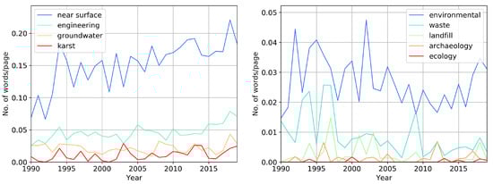 Figure 5 breaks down the frequency of terms in engineering geophysics. The left graph shows a steady increase in the mentions of words “near surface” and “engineering” in the past 30 years. Near-surface geophysics is mainly engaged in engineering tasks. The graph on the right shows the frequency of study objects in near-surface geophysics. On average their frequency does not change with time. It is worth noting the increase in the use of terms “environmental” and “waste” in the 90s. The word “waste” is found in the text with the following adjectives: hazardous, radioactive, nuclear, and others. The word “groundwater” is slightly growing in occurrence, showing that the task of finding water has become more relevant lately. We see that “ecology” and “archeology” do not occur much in the proceedings. Overall, we observe a slight increase in engineering geophysics terms.