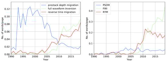 Of all the trigrams, the most frequently used now is “full waveform inversion” (Figure 6), and it is still growing together with the abbreviation “FWI.” Full waveform inversion is a complicated data-fitting technique based on using the entire content of wavefield in order to extract quantitative information from seismic data []. The second one is “reverse time migration,” and the 2019 top three close with “convolutional neural network.” Figure 6 shows how the occurrence of “prestack depth migration” was surpassed by “full waveform inversion” and “reverse time migration.” The frequency of occurrence is higher if we consider abbreviations, in the right part of Figure 6. It is interesting to note that the abbreviations “FWI” and “RTM” are used more often than “PSDM,” even when it was much more accessible. Perhaps this suggests a tendency to reduce and simplify terms. Some terms inevitably supplant other words, provided that the volume of published material is approximately the same. While reviewing conference proceedings for the last 30 years, we found many terms that were popular in the past, but did not find applications in the modern world. Figure 7 (left) breaks down other trends in the seismic data processing algorithms. We see that “machine learning” appeared in the SEG annual conference proceedings more often in the past few years. The occurrence of “broadband” started to increase in the early 2010s, with a decline in 2016–2018, and it began to grow again in 2019. Using a wider frequency range and inclusion of low frequencies proved to contribute to better resolution, penetration, and inversion []. In addition, “Marchenko” begins to emerge. “Marchenko” is a set of data-driven methods that help us to project surface seismic data to points in the subsurface. It relates the Green’s function from a virtual source inside a medium to the reflection response at the surface of that medium [,]. The “Markov”-chain-based approach is able to account for the change in seismic response of damaged structures [], and it correlates with the occurrence of the word “seismicity.” The term “seismicity” is used for induced seismicity risk estimation [], mine development [], and other applications. It is known that “machine learning” and “neural networks” have recently significantly evolved towards image recognition. In seismic data processing, “machine learning” is assumed to be really helpful with interpolation, automatization of reflection tracking, and data reconstruction from the under-sampled or missing traces []. We will devote a separate section of the paper to the usage of “neural networks.”