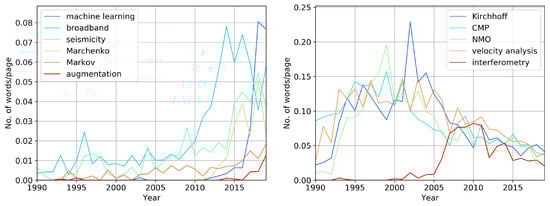 Figure 7 (right) shows classic methods of seismic data processing and related terms. We see the rise and decline in the appearance of these methods in the last ten years. These methods were developed in the 1990s, by now they have already been studied sufficiently, and therefore their usage is declining. It should be noted that despite the decline in the frequency of occurrence of “Kirchhoff” (migration), “CMP” (Common Mid Point) gather, “NMO” (Normal Move Out), “velocity analysis” and “interferometry,” all of these words are used in industrial seismic activities. These words are still used quite often, but research and development of the methods associated with them occurred in the 1990s and early 2000s. The decrease in the frequency of occurrence suggests that research on this topic has decreased.