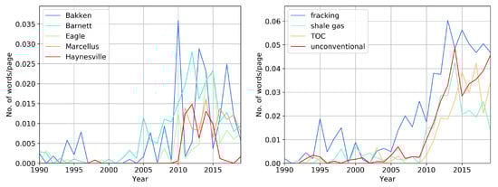 Figure 8 shows the most often used names of shale plays on the left, and “fracking” (includes “hydraulic fracturing,” “frac,” and “fracking”), and “shale gas” + “gas shale” on the right. We observe that the shale-related terms peaked between 2005 and 2015, and declined afterwards. In the past 20 years, “Bakken” [,] and “Barnett” [,] shales were mentioned more frequently than all other shale deposits. In 2019 “Marcellus,” “Eagle” (Ford), and “Barnett” have similar occurrences, about one time per hundred pages. However, the term “fracturing” does not show such a fast decline. Despite the fact that the names of gas shale deposits declined in use over the past three years, words that relate to the development and description of these deposits (“fracking,” “TOC”-total organic carbon, “unconventional”) showed continuing robust use.