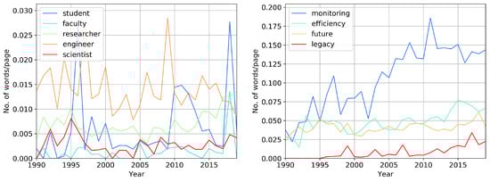 It is curious that in 2018, we observe an increase in the words “student,” “faculty,” and “researcher," see Figure 9 (left). Does this mean that the number of academic papers grew then? You may notice the peaking of “engineer” after peaking of “student.” We observe growth in the frequency of “researcher” in the past ten years, and this word appeared more often than “engineer” in 2019. During the 1990s, we see more of “engineer” in comparison with “researcher” and “scientist.” In the past decade, this situation reversed, bringing “researcher” to the first place.