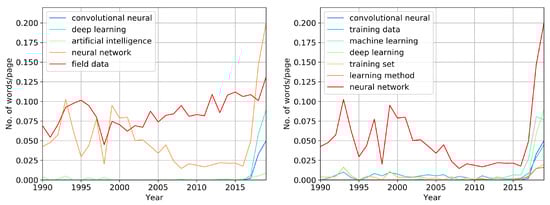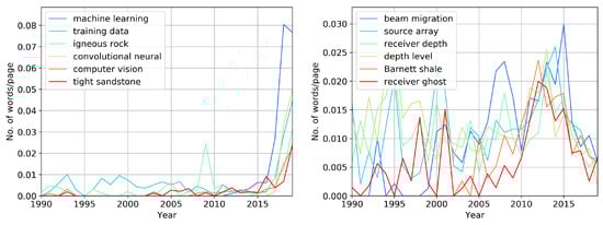Besides “neural network”-related terms in Figure 12 (left), we observe an increase in usage of “tight sandstone” and “igneous rock.” It is interesting to note that for 30 years, “igneous rocks” were rarely discussed, except for 2009. In 2018 and 2019; however, we observe several papers discussing igneous rocks found in the Chinese and Brazilian oil fields. Their acoustic and elastic properties must be considered in reservoir characterization []. In Figure 12 (right) one can see the bigrams that show a decrease in the frequency of occurrence in the past four years. When new research topics appear, they will partially or entirely replace the old ones, because the number of articles is limited each year.