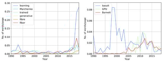 Figure 11 (right) shows words that decreased in occurrence in the past four years. Interestingly, there has been a reduction in the use of the abbreviation “GPU” by researchers, as opposed to seven to eight years ago when the abbreviation was trending. The “Barnett” shale is one of the most well studied shale deposits, and the authors believe that the fading of interest in it is a natural phenomenon related to terminal production decline there []. Curiously, there increased interest in “basalt” at the turn of the century, and we observe the second increase in the early 2010s.