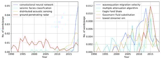 Let us now consider the fastest growing and declining trigrams, Figure 13. “Convolutional neural network” (CNN) shows the fastest growth; the second one is “distributed acoustic sensing” (DAS), which is related to the fiber-optic measurement systems. In the recent few years, researchers were using CNN to perform “seismic facies classification,” which is why we observe an increase in usage of this term. We also see a relative increase for “ground penetration radar;” however, we see this term more often during the 1990s and early 2000. Figure 13 (right) shows a decrease in the use of specific seismic terms, as for the case of bigrams and the names of the shale plays. From 2010 to 2019, we observe an increase and decrease in interest in the phrase “towed streamer EM.” Towed streamer electromagnetic systems allow one to collect data at a high rate and over huge survey areas []. It is necessary to have significant objects to survey broad areas. Presently, only smaller oil and gas exploration projects exist, “towed streamer EM” is used less often.