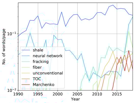 We have analyzed 21,864 papers on 115,973 pages consisting of 52 million words, or more than 347 million symbols. Alteration of professional language reflects the often subtle changes in industry and science. The decrease of research on new fields/locations forces geophysicists to study more the historical data and to look for new processing techniques like neural networks. As a result, we can assume a decline in the field of geophysics and a decrease in the geophysical market shortly. Over the last 30 years, the geophysical objects and methods have changed only slightly. There has been an increased interest in “shales” in the last ten years. In the past six years, the frequency of use of the “shale” has been falling, but the use of “unconventional,” “TOC,” and “hydraulic fracturing” has not decreased in recent years, Figure 14. At the same time, new methods of processing and capturing data appeared, and led to a change of language. “Neural network” and related subjects have shown the fastest growth in the last two years. We doubt that this growth will continue at the same rate as the term “neural network” is already used more than “field data” needed to feed the hungry training algorithms. We see an increase in the use of the words “Marchenko,” “seismicity,” and “broadband.” We also observe the rapid growth of “fiber,” which is more likely related to the fiber optical sensing systems. In the future, we might see more projects on “monitoring” of oil and gas fields and increasing production “efficiency,” while there will be less work on the exploration of new oil and gas fields.