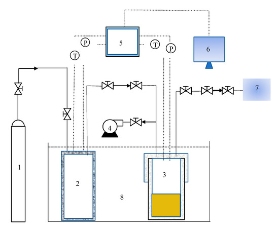 Figure 1. Schematic diagram of hydrate formation experimental reaction device. 1. Gas cylinder, 2. buffer tank, 3. high-pressure reactor vessel, 4. vacuum pump, 5. data acquisition system, 6. computer, 7. gas chromatograph, and 8. thermostatic bath.