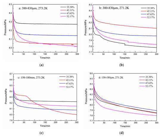 The pressure curves during hydrate formation under different experimental conditions are shown in Figure 2. As shown in Figure 2a, in the first 300 min, the pressure drop and gas consumption increased as the water content increased from 35.3% to 52.17% for the type-A zeolite at 273.2 K. In addition, the pressure drop in the initial 50 min accounts for more than 80% of the total pressure drop. As shown in Figure 2b, when the temperature was reduced to 271.2 K, a large pressure drop occurred because of the “secondary formation” of hydrates, but the other conditions remained unchanged. The pressure drop was largest with the type-A zeolite at 271.2 K having a water content of 35.30%, but it increased as the water contents increased from 42.11% to 47.62% and 52.17%. For type-B zeolite (i.e., smaller particles), the gas pressure drop was the largest at water contents of 42.11% and 52.17% at 273.2 K, and 271.2 K, respectively, as shown in Figure 2c,d. The pressure drop increased with the increase in water content in the initial 300 min for the type-B zeolite at 271.2 K (Figure 2d). In general, in the type-B zeolite system, the magnitude of the gas pressure drop and its trend with water contents at 271.2 K changed little, compared with those of the other systems. In addition, the trends in the pressure drop with different water contents were also different when the other experimental conditions were fixed, as shown in Figure 2b,c. It was found that, under certain experimental conditions, the hydrate reaction proceeded in two stages. As shown in Figure 2b,c, when the water contents were 35.30% and 42.11%, the gas phase pressure dropped rapidly in the initial stage of the reaction. Then, there was a plateau stage where the pressure drop was very slight, that means hydrate formation rate was low at this stage, and then, it dropped sharply again until the end of the reaction. At the same time, under these conditions, the total decrease in gas pressure was the greatest.