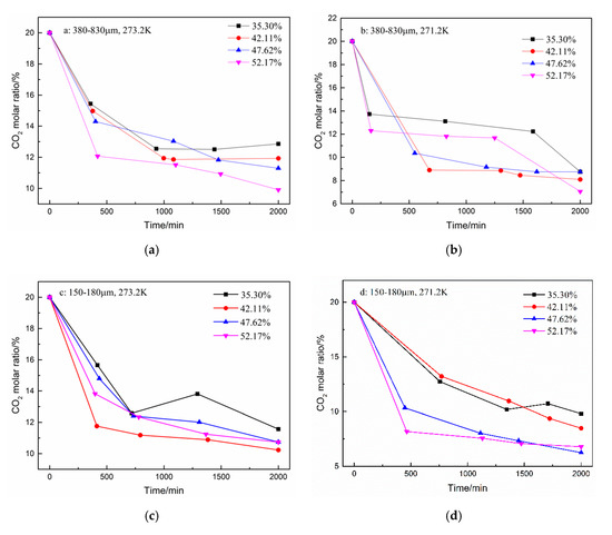 Figure 4. CO2 molar ratio in the gas phase after hydrate formation under different conditions. (a): 380–830 μm, 273.2 K; (b): 380–830 μm, 271.2 K; (c): 150–180 μm, 273.2 K; and (d): 150–180 μm, 271.2 K.