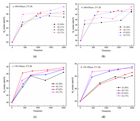 Figure 5. N2 molar ratio in gas phase after hydrate formation under different conditions. (a): 380–830 μm, 273.2 K; (b): 380–830 μm, 271.2 K; (c): 150–180 μm, 273.2 K; and (d): 150–180 μm, 271.2 K.