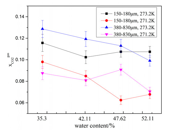 Figure 6. CO2 molar concentration in the remaining gas phase ( x C O 2 g a s ) in the presence of different amounts of water.