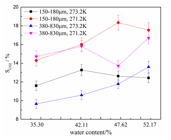 The experiments were carried on with two different particle size distributions (type A: 380–830 and type B: 150–180 μm) and four water contents (35.3 wt.%, 42.11 wt.%, 47.62 wt.%, and 52.17 wt.%, reported as simple percentages, hereafter) to study the hydrate formation kinetics and evaluate the CO2 separation effect under different temperature and pressure conditions. The experimental conditions and results are summarized in Table 2. The initial gas pressure was 8.5 MPa.