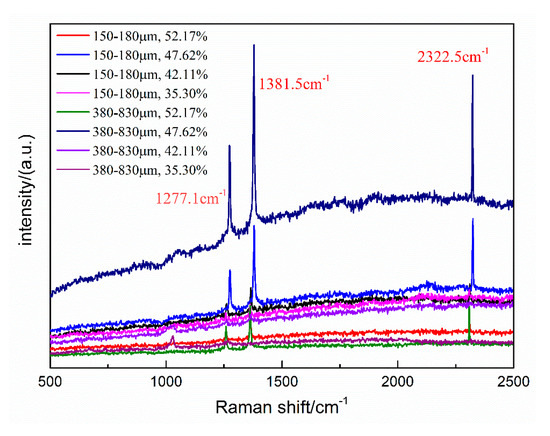 The molecular sizes of CO2 and N2 are different, so CO2 form typical structure I (sI) hydrates, and N2 form typical structure II (sII) hydrates. The Raman shifts of pure CO2 hydrates occur at about 1276.6 and 1381.1 cm−1, whereas the Raman shift of N2 is about 2324.5 cm−1 [30]. For hydrates with multicomponent guest molecules, a different hydrate structure can form, and the Raman displacement will be correspondingly affected. Hydrates formed of binary gas mixture of CO2/N2 (CO2 gas molar ratio < 1%) can be structure II (sII) hydrate. However, the sI hydrate forms if the CO2 molar ratio is increased to 20% [22]. Meanwhile, the diameter of 5A zeolite is similar to that of the hydrate cage structure. Hydrate samples formed under different conditions were analyzed by Raman spectroscopy, in order to investigate whether the 5A zeolite affects the structure of the hydrates and the distribution of CO2 and N2 contained within. The Raman spectra of hydrate samples in type-A and B zeolite systems with different water contents at 271.2 K are shown in Figure 8.