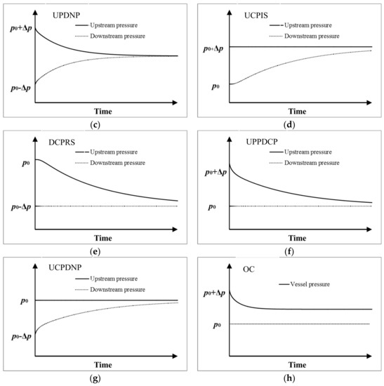 Since the OC method uses only one vessel, there is only upstream pressure in Figure 2h. Among them, the boundary conditions of UPP and DNP, UCPIS and DCPRS, UPPDCP and UCPDNP have antisymmetric relations. According to the boundary conditions, these methods can be divided into three types. The first type of method uses two vessels, and the upstream and downstream pressures change with time, including UPP, DNP, UPDNP; the second type of method has one vessel with constant pressure and another vessel with changing pressure, including UCPIS, DCPRS, UPPDCP, PUCPDNP; the third type of method is OC.