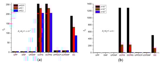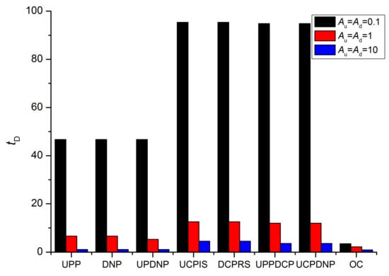 The pressure derivative method proposed by Han et al. [17] was used to analyze the pulse decay test of dual-medium cores. The pressure derivative here actually refers to the absolute value of the pressure derivative, which can help identify the dual-medium and facilitate the fitting of model parameters. As a result that the upstream and downstream pressure derivative curves of the UPP, DNP and UPDNP methods generally coincide, other methods have only upstream or downstream pressure derivatives, so only one pressure derivative curve is selected for later analysis. The boundary conditions of the three pairs of methods (UPP and DNP, UCPIS and DCPRS, UCPDNP and UPPDCP) are antisymmetric. In Figure 6, the pressure derivatives of each pair coincide with each other. Therefore, the subsequent analysis must only select one of the methods from each pair. The pressure curves of the UCPIS, DCPRS, UPPDCP, and UCPDNP methods do not have obvious dual-medium characteristics. However, their pressure derivative curves is similar to that of the UPP method, which have the characteristics of pressure derivative plateaus (for the DCPRS method, Au = Ad = 10, 0.1 < tD < 10) and constant-slope straight line sections (for the DCPRS method, Au = Ad = 10, 300 < tD < 10,000) for dual media. The duration of the early pressure derivative plateau increases with the increase of the vessel volume (increase of Au and Ad). However, the value of the derivative pressure decreases with the increase of the vessel volume.