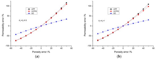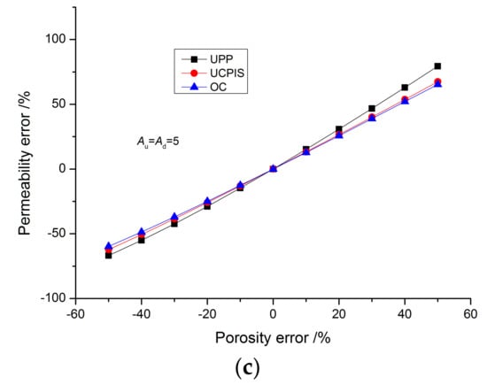 Effect of the porosity error on the permeability precision: (a) Au = Ad = 0.5; (b) Au = Ad = 1; (c) Au = Ad = 5.