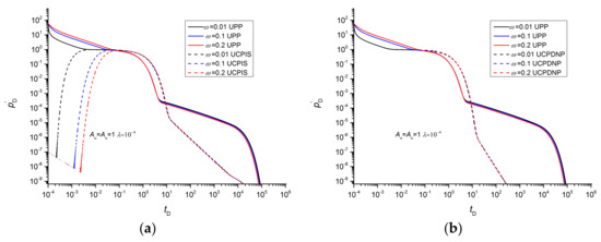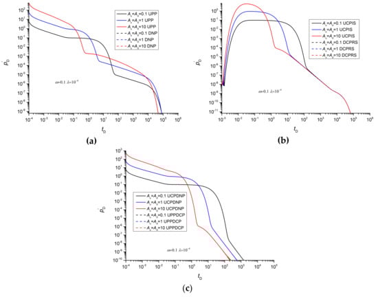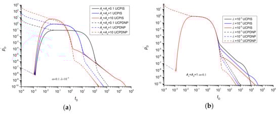 Figure 8 is a comparison of the pressure derivative curves of the UCPIS and UCPDNP methods. The vessel volume, interporosity flow coefficient and storativity ratio have identical effects on the pressure derivatives of the UPP, UCPIS and UCPPD methods. The two methods have consistent pressure derivatives in the plateau period (Figure 8a, when Au = Ad = 10, 0.1 < tD < 10) and transition period (Figure 8a, when Au = Ad = 10, 10 < tD <100). In the later period, the UCPIS method has a larger pressure derivative and a smaller slope of the straight-line segment with constant slope than the UCPDNP method. For the UCPIS method, the pressure derivatives of different vessel volumes coincide at the straight-line segment with constant slope, and the vessel volume only affects the initial time of this segment. However, the initial time and value of the straight-line segment with constant slope of the UCPDNP method are affected by the volume of the vessel.