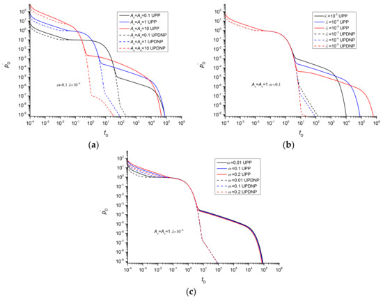 Figure 7 shows a comparison of the pressure derivative curves of the UPP and UPDNP methods. The effects of the vessel volume, interporosity flow coefficient, and storativity ratio on the pressure derivatives of the UPP and UPDNP methods have the same law. In the early stage (Figure 7a, tD < 0.1), the pressure derivative of the UPDNP method was slightly smaller than that of the UPP method. The early pressure is only affected by the upstream boundary conditions. However, the definition of dimensionless pressure uses the pressure difference between upstream and downstream vessels, resulting in the upstream dimensionless pressure pulse of the UPDNP method is only half of that of the UPP method. These two curves coincide in the plateau period (Figure 7a, when Au = Ad = 10, 0.1 < tD < 10) and transition period (Figure 7a, when Au = Ad = 10, 10 < tD < 100). In the later period, the slope of the constant-slope straight line segment of the UPDNP method is larger than that of the UPP method, but the UPDNP method has a much smaller pressure derivative than the UPP method. This difference may make the pressure derivative in the later stage of the UPDNP method too small to be identified, which is not conducive to obtaining dual-medium parameters. The storativity ratio has little effect on the pressure derivative in the later period.