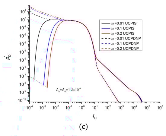 Comparison of pressure derivative curves between the UCPIS method and UCPDNP method: (a) Au and Ad; (b) interporosity flow coefficient; (c) storativity ratio.