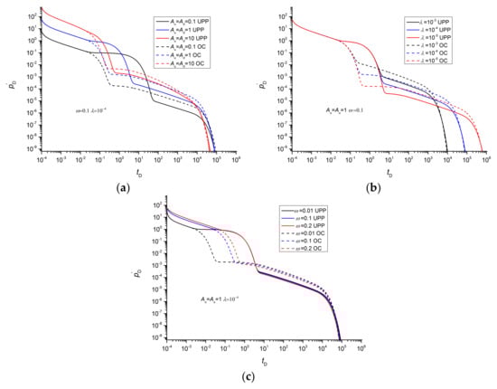Comparison of pressure derivative curves between the UPP method and OC method: (a) Au and Ad; (b) interporosity flow coefficient; (c) storativity ratio.
