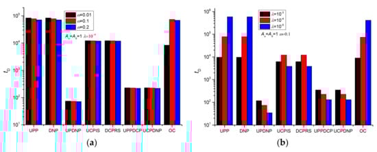 For dual-porosity cores, the upstream and downstream pressures are considered equilibrated when their dimensionless pressure difference is less than 10−4. When the vessels and core have balanced pressure, it is the final pressure equilibrium. Since only the pressure of upstream and downstream vessels can be measured, taking the dimensionless pressure derivative of 10−9 as the final pressure equilibrium, Figure 11 shows the upstream and downstream pressure equilibrium time of various methods. Unlike homogeneous cores, the upstream and downstream equilibrium time of the dual-medium core can be divided into four groups: UPP, DNP, and UPDNP are the first group; UCPIS and DCPRS are the second group, UPPDCP and UCPDNP are the third group; OC is the fourth group. The upstream and downstream equilibrium times of different methods in each group are basically equal. The upstream and downstream pressure equilibrium times of the second group may be three orders of magnitude higher than that of the first and third groups. The fourth group has slightly lower upstream and downstream equilibrium times than the second group. The third group has approximately twice as long upstream and downstream equilibrium times as the first group. The upstream and downstream pressure equilibrium times slightly decrease with the increase in storativity ratio and sharply increase with the increase in interporosity flow coefficient. When the interporosity flow coefficient is less than 10−5, various methods have similar equilibrium time.