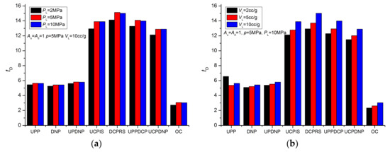 Figure 9a is a comparison of the pressure derivative curves of the UPP and UCPIS methods. These two methods coincide in the plateau period. However, under identical conditions, the UCPIS method has a longer plateau period. Figure 9b is a comparison of the pressure derivative curves of UPP and UCPDNP methods. Their pressure derivative curves coincide in the early stage and plateau period. The plateau period of the UCPDNP method is longer. This is because, compared with the UPP method, the UCPDNP and UCPIS methods have a constant pressure vessel, which is easier to maintain the pressure difference between the upstream and downstream vessels and slow down the time of entering the interporosity flow stage. The UPP method has a larger pressure derivative at the later stage and a smaller slope of the straight-line segment than the UCPIS and UCPDNP methods. However, compared with Figure 7, it can be found that the later pressure derivatives of UCPIS and UCPDNP methods are larger than that of the UPDNP method. Therefore, they can better identify the interporosity coefficient than the UPDNP method but not as well as the UPP method.