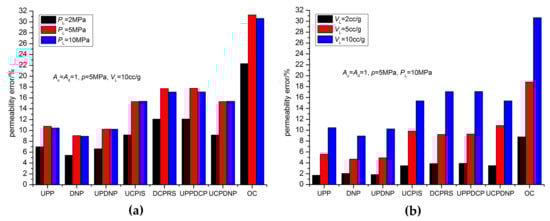 When the core is strongly adsorptive to the test gas, if the homogeneous model is used to analyze the test data, it will introduce errors to the permeability. Since Han et al. [23] have analyzed the effects of gas adsorption parameters and test parameters on the analysis results of the permeability, this study only compares the effects of gas adsorption on various test methods. Figure 14 shows that the effect of gas adsorption on the permeability of different test methods. The influence of gas adsorption on different test methods conforms to the three-type classification method of the homogeneous model. The error of each type of methods is relatively similar. The error increases in the order of the first to third type of methods. When the pore volume is close to the vessel volume, the error of the first type of method is less than 10%; the error of the second type of method is less than 20%, and the error of the third type of method is generally less than 30%. The error increases when the Langmuir volume increases. The effect of Langmuir pressure on the error is not monotonous, because the relationship between Langmuir pressure and the adsorption amount is nonlinear. The UPDNP method cannot eliminate the effects of gas adsorption as reported by Feng et al. [30].