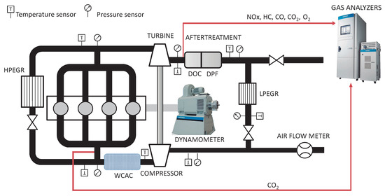 The engine layout is depicted in Figure 2, where the main components of the engine and the temperature and pressure measurement points are indicated. These points correspond to the intake and exhaust manifolds, and the inbound and outbound ducts of both compressor and turbine. The pollutant emissions points were measured upstream the after-treatment system, in order to calibrate the emissions sub-model. For the validation of the DOC and DPF sub-models, exhausts were measured upstream and downstream the after-treatment system, as explained by Payri et al. [21].