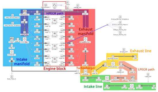 The gas dynamics software VEMOD [22] has been used for this study. In VEMOD, the air management is computed by means of a one-dimensional (1D) gas dynamics model that performs the calculations of the flow properties along the intake and exhaust systems as well as the high and low pressure EGR paths. Thus, specific sub-models are considered for the boosting system [23,24], air-charge and EGR coolers, throttle valves, heat transfer including gas-to-wall heat exchange and wall temperature prediction, after-treatment sub-models (DOC and DPF), a 0D turbocharger model, and a hydraulic circuit model. The gas dynamics model is coupled to a cylinder model that predicts the in-cylinder conditions based on the combustion process. Detailed heat transfer model is used to obtain the heat rejection to the chamber walls, while the mechanical losses model allows for obtaining the brake power. An emission sub-model is coupled to the combustion process to predict raw NOx, CO, HC, and soot emissions as a function of the engine operating conditions. Figure 3 represents the air path systems present in the virtual engine model. Different systems have been remarked in the scheme, such as the intake and exhaust manifolds, the turbocharger, and the high and low pressure paths, as well as the positions of the sensors that send data to the virtual ECU (Engine Control Unit) model.