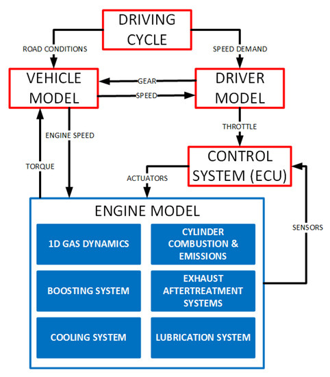 Figure 4 shows the flow-chart of the virtual engine model. The blue boxes represent the thermo and fluid dynamics sub-models described above, while the red boxes represent the different control sub-models, which have been developed in Matlab/Simulink. They operate the engine model by actuating over the different actuators that are defined in the engine model. The driver and vehicle model can be detached from the control sub-model if just the engine speed and torque setpoints are provided.