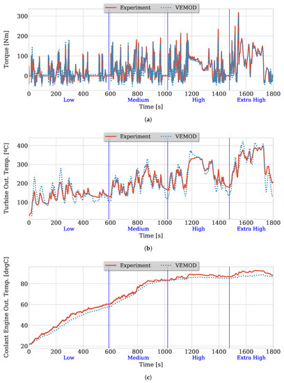 In Figure 5, several variables are represented comparing experimental measurements versus model results. Figure 5a shows engine brake torque with a coefficient of determination () of 0.882. This comparison has been done by setting the imposing the experiment fuel mass at each time step of the simulation. The air mass flow target is controlled by the ECU sub-model actuating over the VGT position and the EGR valves. The resulting simulated torque is accurate all along the WLTC.