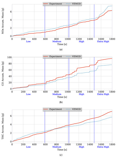 Worldwide Harmonized Light-Duty Vehicles Test Cycle (WLTC) model emissions, engine start at 20 °C room temperature. (a) accumulated NOx mass; (b) accumulated CO mass; (c) accumulated total hydrocarbons mass.